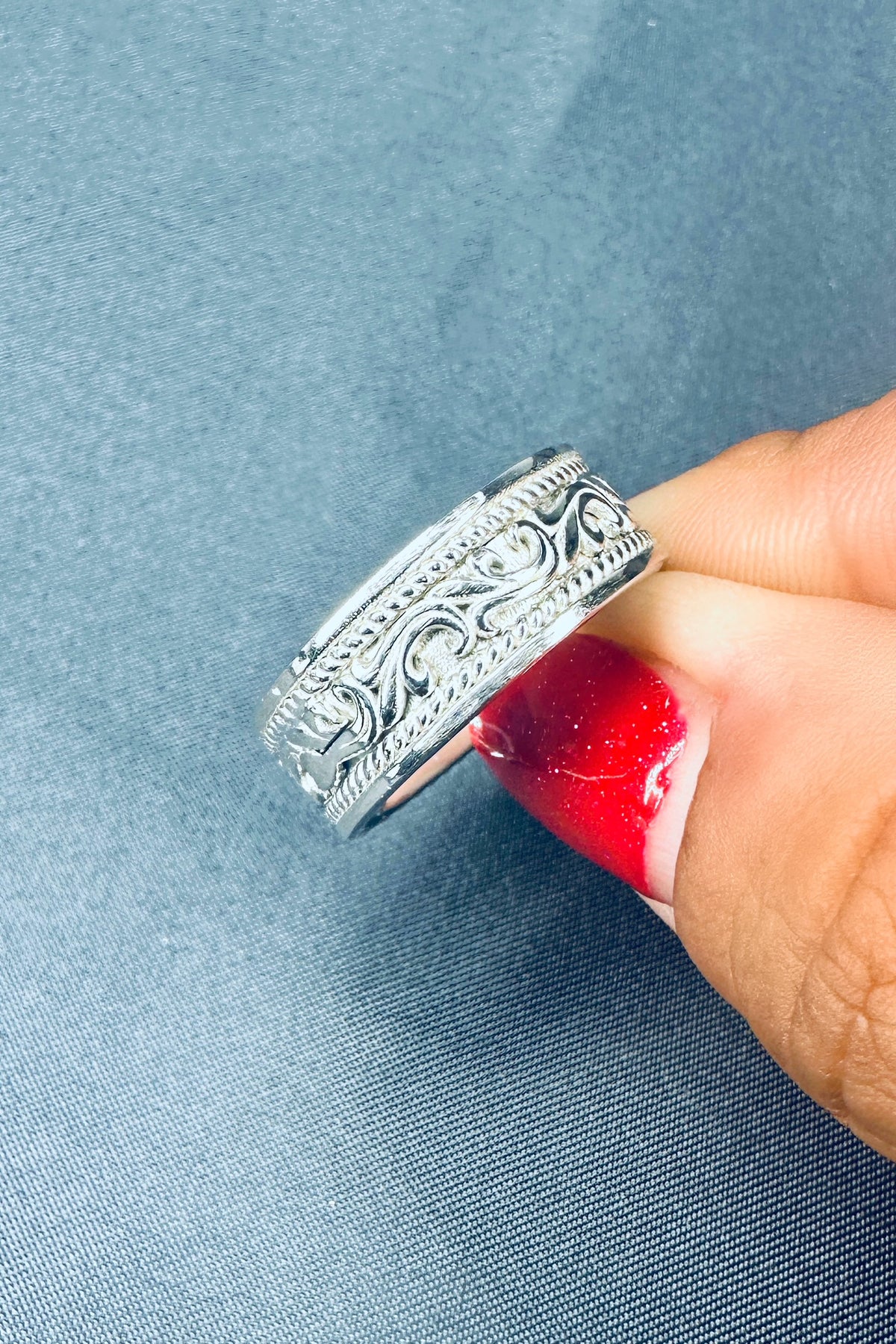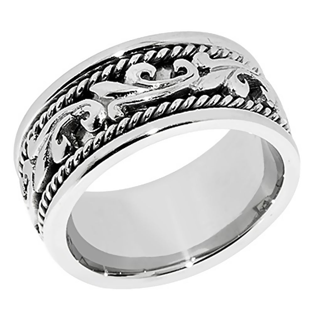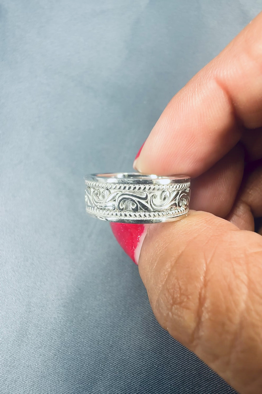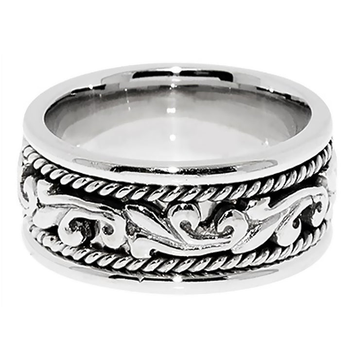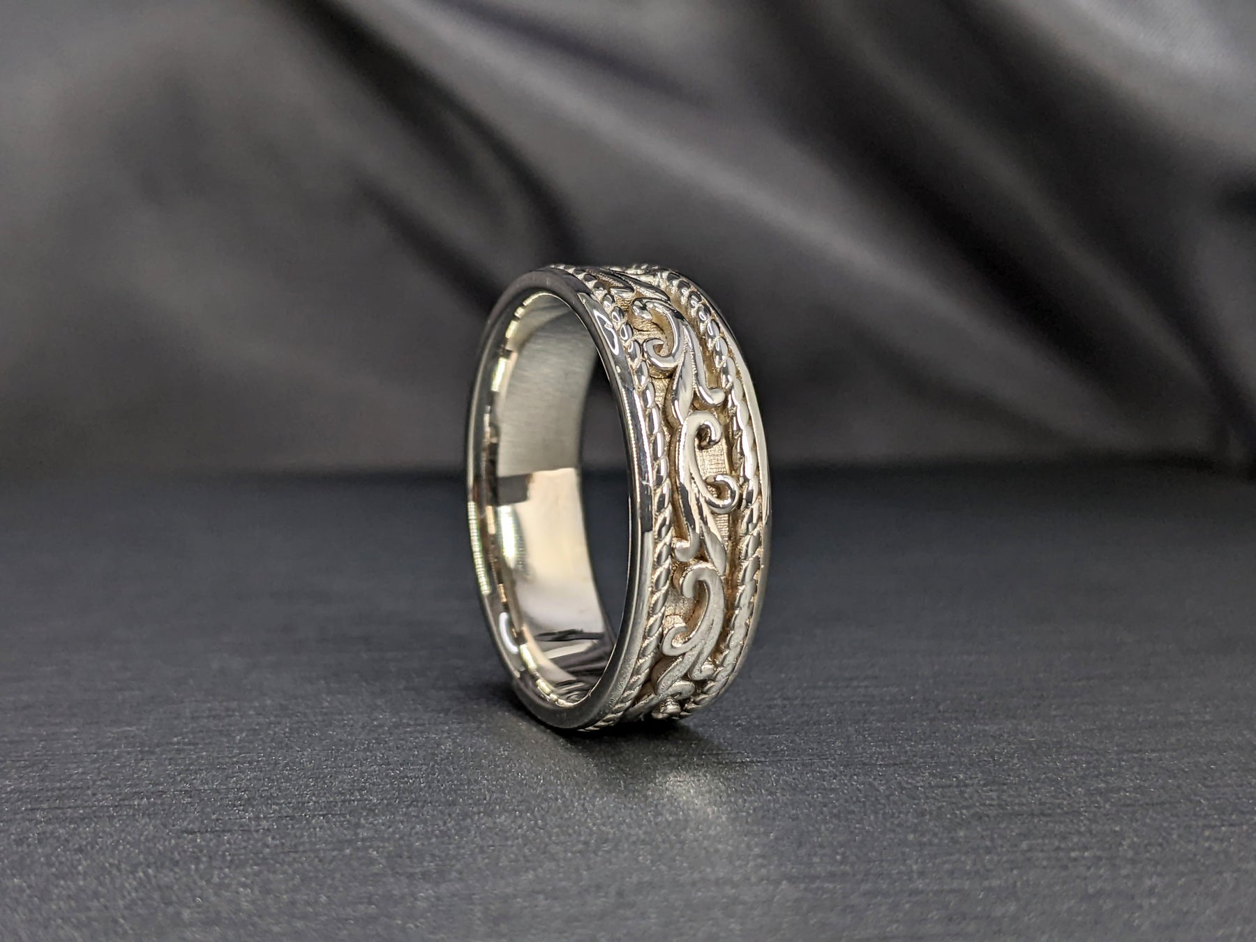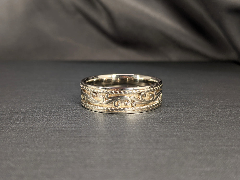This 8 mm band has a unique antique design in the center with two hand braided ropes on the edges with a comfort-fit band in a high polish finish. Handcrafted in your choice of 14k Gold or 18k Gold setting. We also offer a 1-Year Layaway program. You can reach us at 1-888-967-5353 to speak to one of our jewelry specialist.