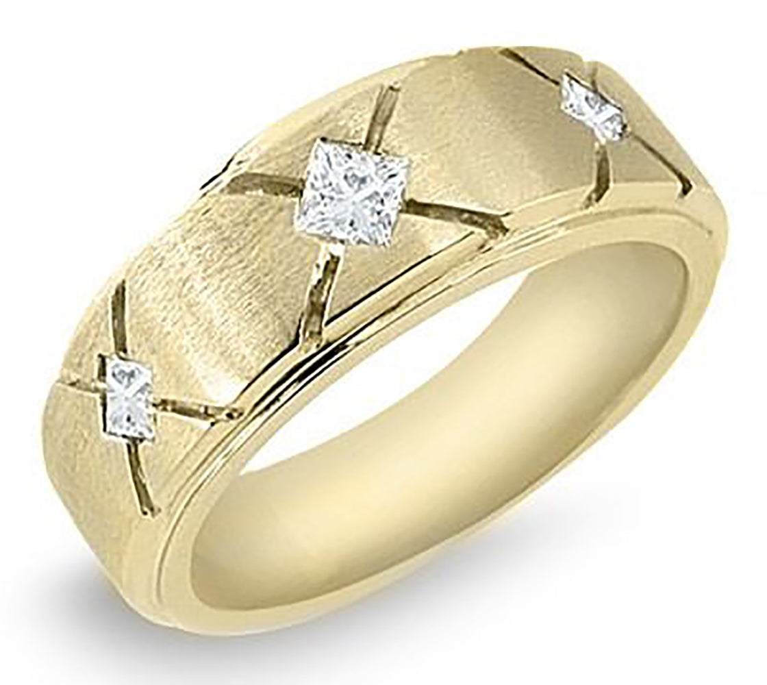 Unique men's diamond band with three princess cut diamonds set evenly apart with X-shape cut outs on each diamond to add a unique style to the band. A total of 0.33 ct. tw. princess cut diamonds graded as VS Clarity and G-H Color. Approximately 6 mm in width and a brush polish finish. Handcrafted in 14K Gold or 18k Gold. We also offer a 1-Year Layaway program. You can reach us at 1-888-967-5353 to speak to one of our jewelry specialist.