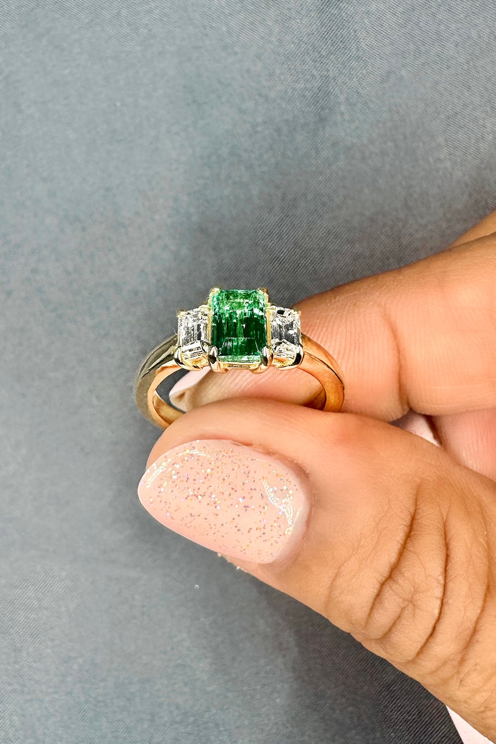 Three Stone 7x5MM Emerald Cut Natural Green Emerald & 0.50 Ct. Tw. Side Diamonds