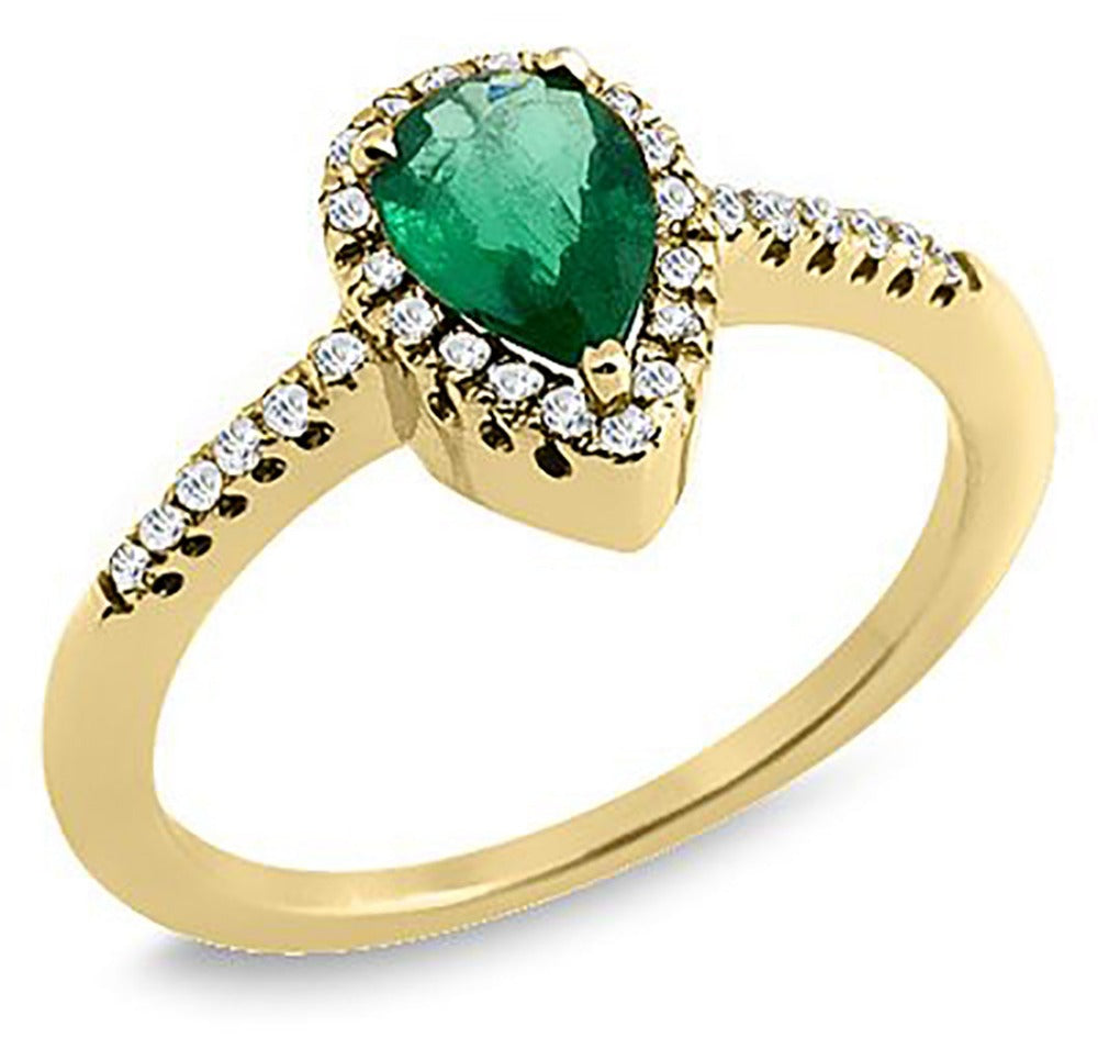 emerald and diamond ring consists of 0.75 ct. tw. pear cut emerald as the center stone, surrounded by 0.35 ct. tw. round brilliant cut side diamonds. The diamonds are graded as SI Clarity and G-H Color. Handcrafted in your choice of 14k Gold, 18k Gold, or Platinum 950 setting. We also offer a 1-Year Layaway program. You can reach us at 1-888-967-5353 to speak to one of our jewelry specialist.