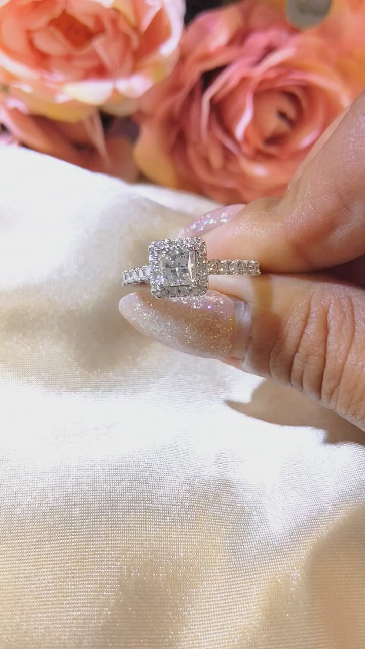 This dazzling princess cut center stone diamond can be customized to weigh in any range between 0.50-2.00 ct. tw. surrounded in a halo design by 0.75 ct. tw. brilliant round cut side diamonds that extend out to the band. Handcrafted in your choice of 14k Gold, 18k Gold, or Platinum 950 setting. We also offer 1 Year Layaway program. You can reach us at 1-888-967-5353 to speak to one of our jewelry specialist.