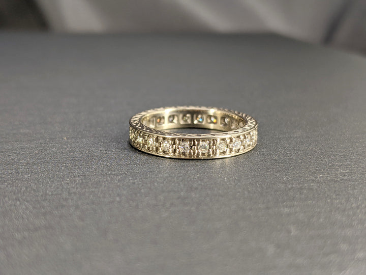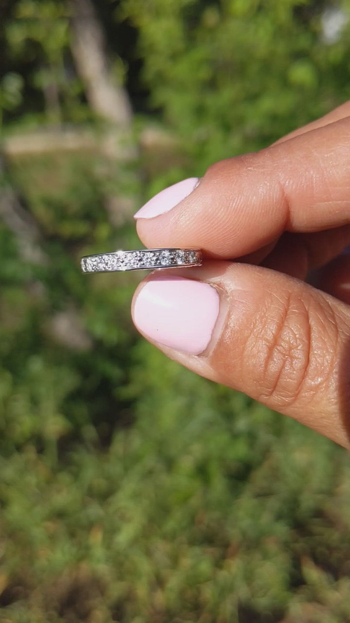 Ladies diamond eternity band the band consists of 0.90 ct. total weight of round brilliant cut diamonds. Set in a pave setting with a milgrain finish on the side of the band. The diamonds are graded as SI Clarity and G-H Color. Handcrafted in your choice of 14k Gold, 18k Gold, or Platinum 950 setting. We also offer 1-Year Layaway program. You can reach us at 1-888-967-5353 to speak to one of our jewelry specialists.