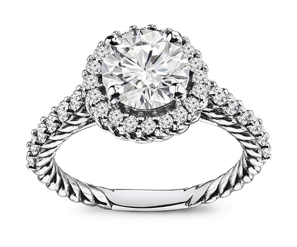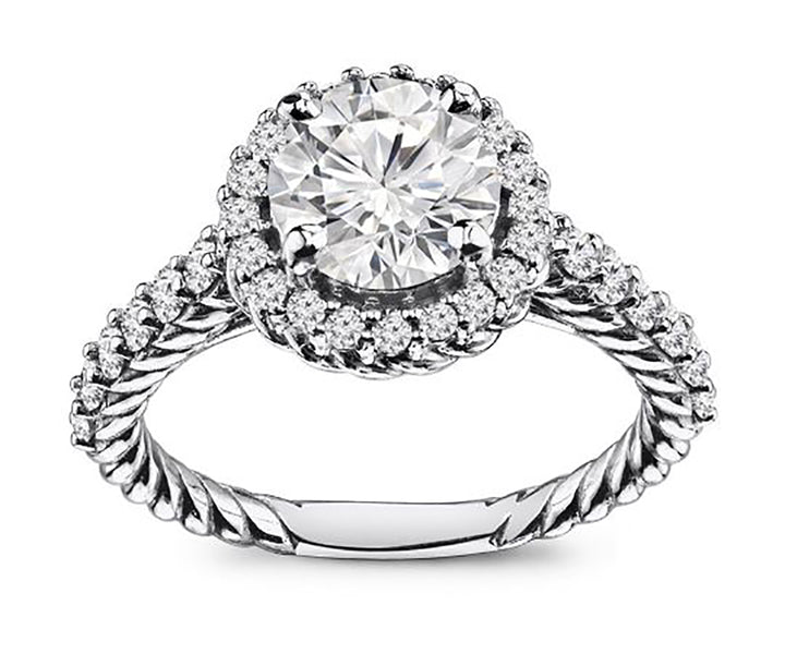 With this beautiful round halo design engagement ring you can customize the center stone between 0.50-2.00 ct. tw. surrounded by 0.25 ct. tw. round cut diamonds as the side stones for the halo and on the unique's rope design band all in a shared prong setting. Handcrafted in 14k Gold, 18k Gold, or Platinum 950 setting. We also offer 1 year Layaway program. You can reach us at 1888-967-5353 to speak to one of our jewelry specialist.