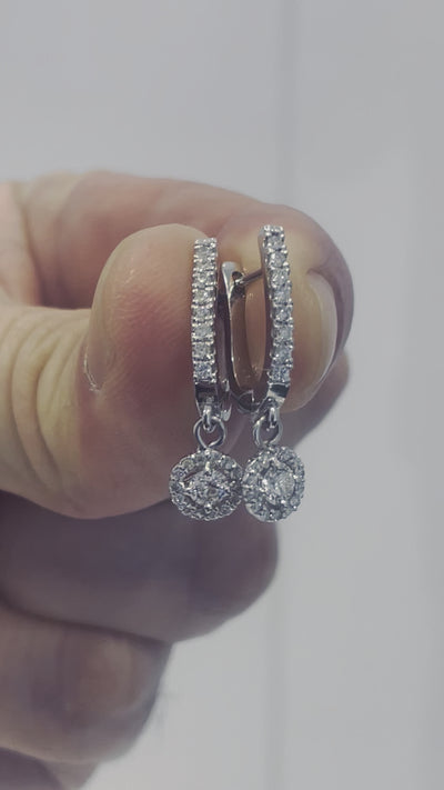 Halo Diamond earrings with tear drop design. Consists of 0.30ct round brilliant cut center diamond on each earring. Surrounded by 0.20ct round cut side diamonds on each earring. The center has a 4-prong setting and the side diamonds are in a pave setting. The diamonds are graded as SI Clarity and G-H Color. Handcrafted in 14k White Gold. We also offer a 1-Year Layaway program. You can reach us at 1-888-967-5353 to speak to one of our jewelry specialist.