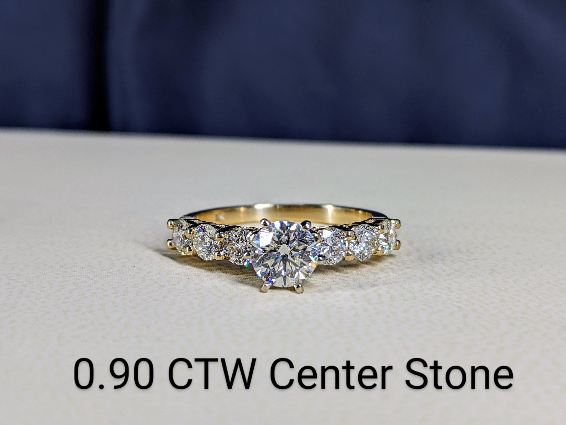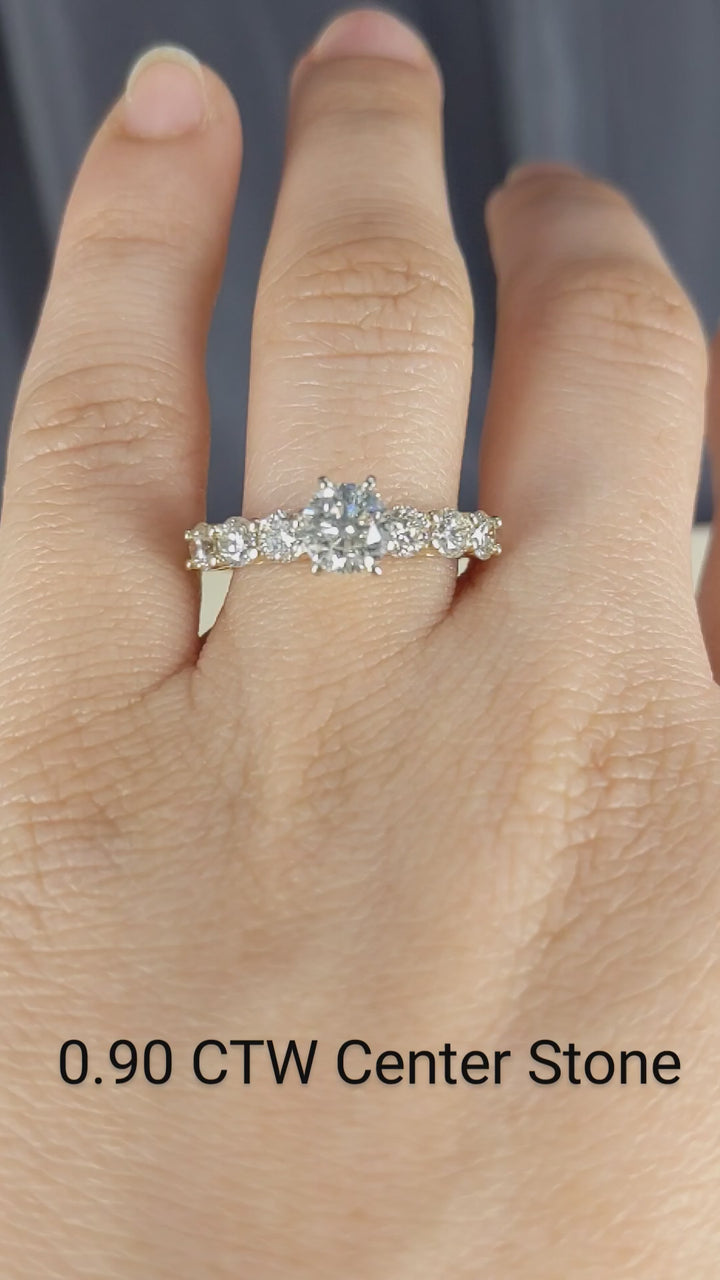 This elegant 7-stone diamond engagement ring consist of brilliant round center stone that may be customized to weigh in size anywhere between 0.50-2.00 ct. tw. surrounded by a total of six stone diamonds, 3 on each side weighing at a total 1.20 ct. in a shared prong setting. Handcrafted in 14k Gold, 18k Gold, or Platinum 950 setting. We also offer 1 year Layaway program. You can reach us at 1888-967-5353 to speak to one of our jewelry specialist.