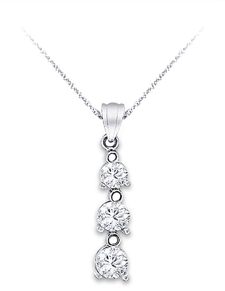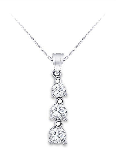 3-Stone diamond pendant in a beautiful drop down setting with 0.50 ct. tw. round cut diamonds graded as SI Clarity and G-H Color. Includes a Free 16 inch gold chain. Handcrafted in 14k White Gold setting. We also offer a 1-Year Layaway program. You can reach us at 1-888-967-5353 to speak to one of our jewelry specialist.