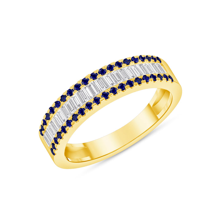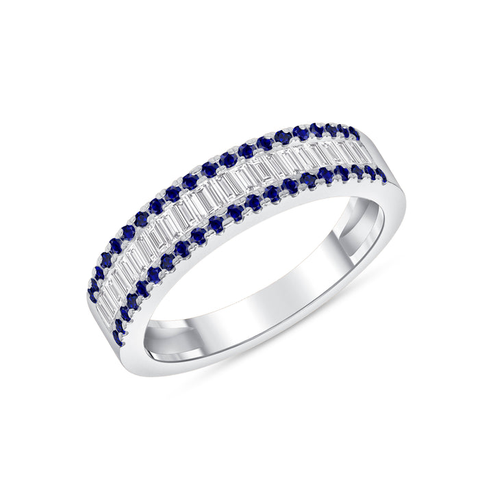 From the Elizabeth collection this 0.50 Ctw. diamond and blue sapphire band is crafted with a beautiful mixture of Round and Baguette cuts, it will add a stunning touch to any occasion. Available in 14K Gold, 18K Gold or Platinum, it measures 4.5mm at its widest point to ensure an exquisite fit. Add some sparkle to your life with this gorgeous wedding band or anniversary ring! Also a perfect gift for any lovers of the color blue or those born in the month of September, what better way to celebrate.