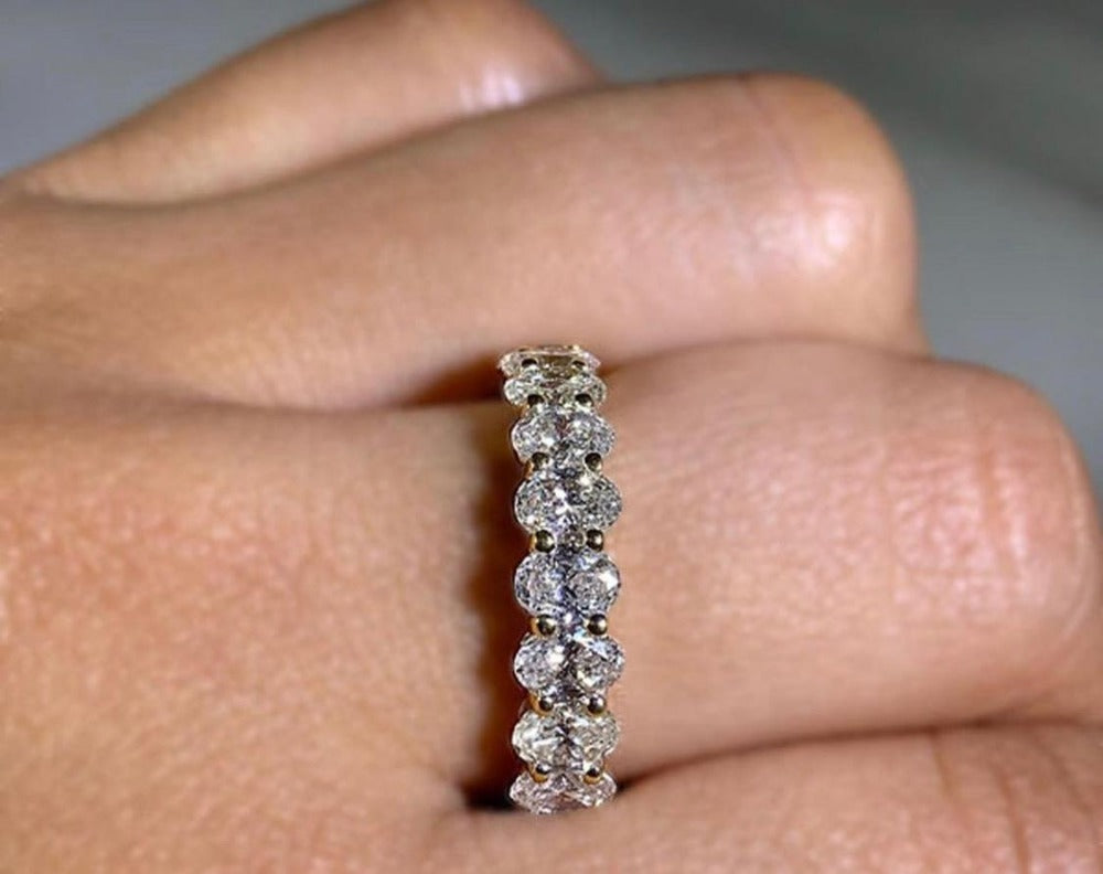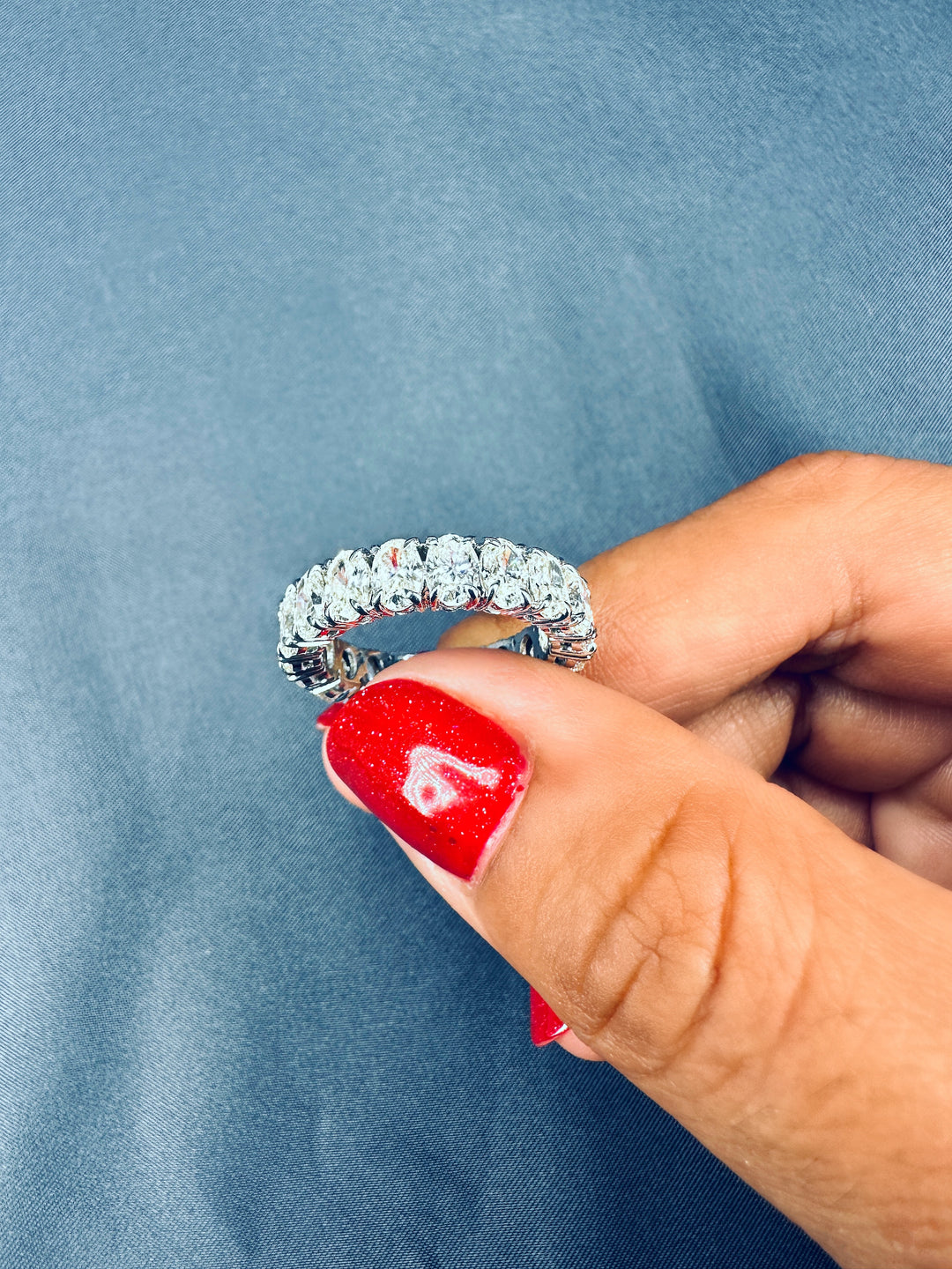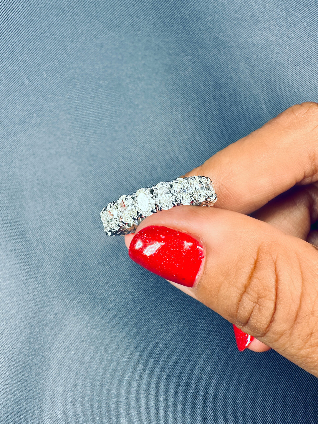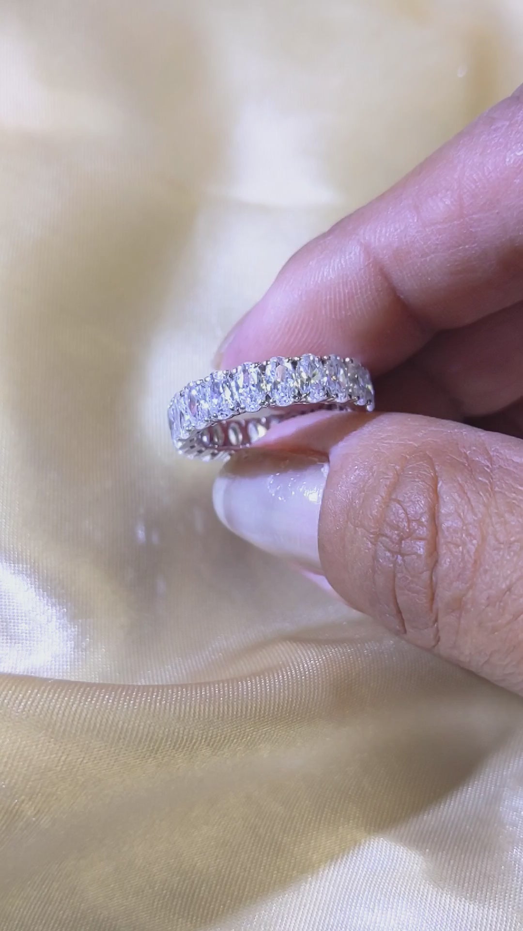 This gorgeous diamond eternity bad consist of 4.25 ct. tw. in oval cut diamonds mounted in a shared prong setting. The diamonds are graded as SI Clarity and G-H Color and shine tremendously! Handcrafted in your choice of 14k Gold, 18k Gold, or Platinum 950 setting. We also offer a 1-Year Layaway program. You can reach us at 1-888-967-5353 to speak to one of our jewelry specialist.