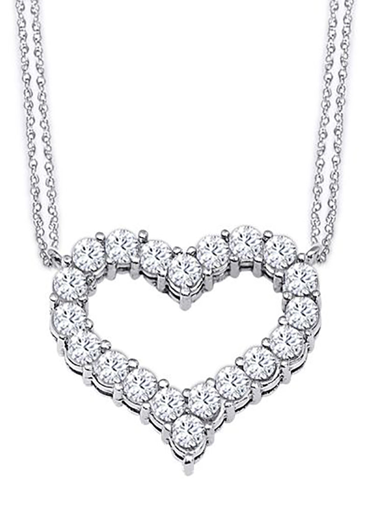 Diamond heart pendant with 1.00 ct. tw. round cut diamonds. Graded as SI Clarity and G-H Color in a shared prong setting. Includes a Free Double 16 inch gold chain. Handcrafted in your choice of 14k Gold, 18k Gold, or Platinum 950 setting. We also offer a 1-Year Layaway program. You can reach us at 1-888-967-5353 to speak to one of our jewelry specialist.