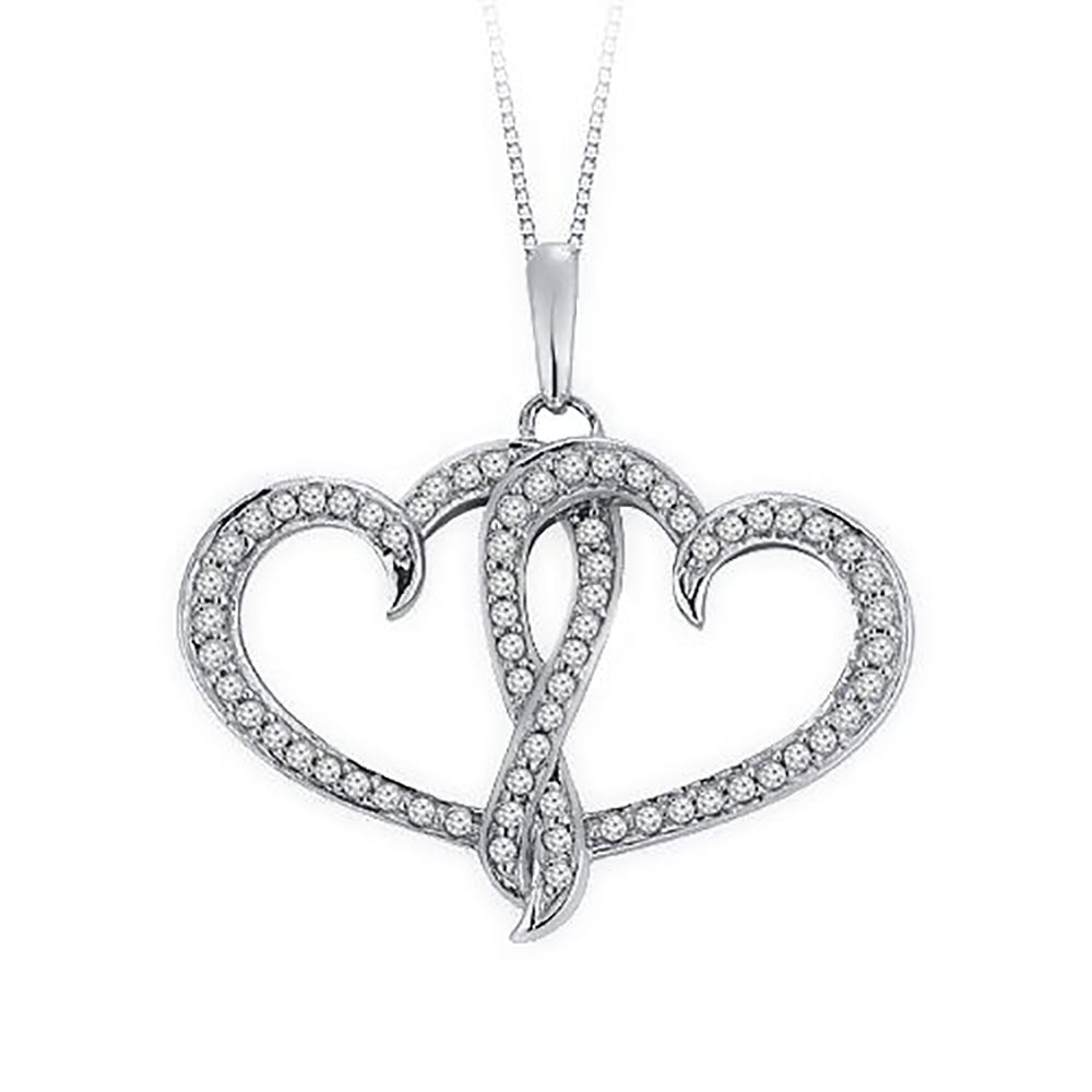 Double inter-locked hearts pendant with 1.00 ct. tw in brilliant round cut diamonds graded as SI Clarity and G-H Color. Includes free 16 inch gold chain. Handcrafted in your choice 14k Gold, 18k Gold or Platinum 950 setting. We also offer a 1-Year Layaway program. You can reach us at 1-888-967-5353 to speak to one of our jewelry specialist.