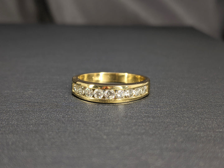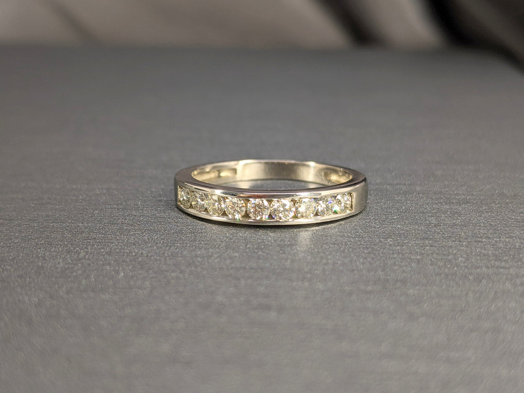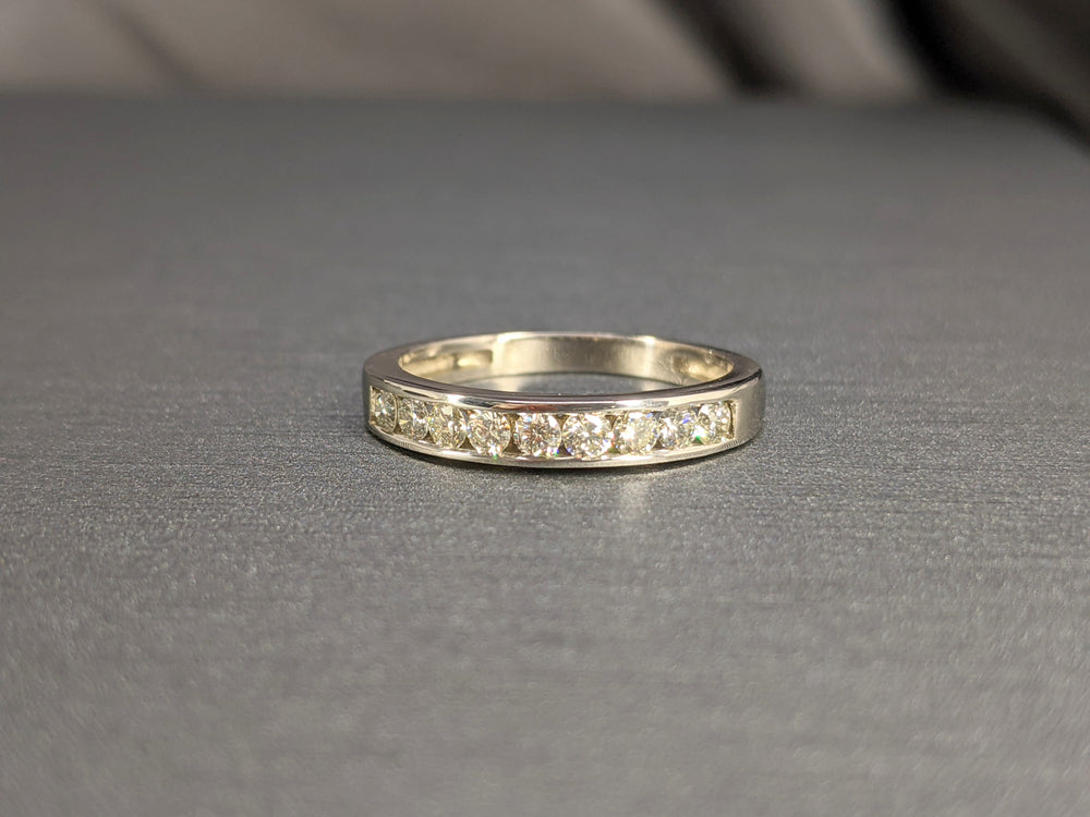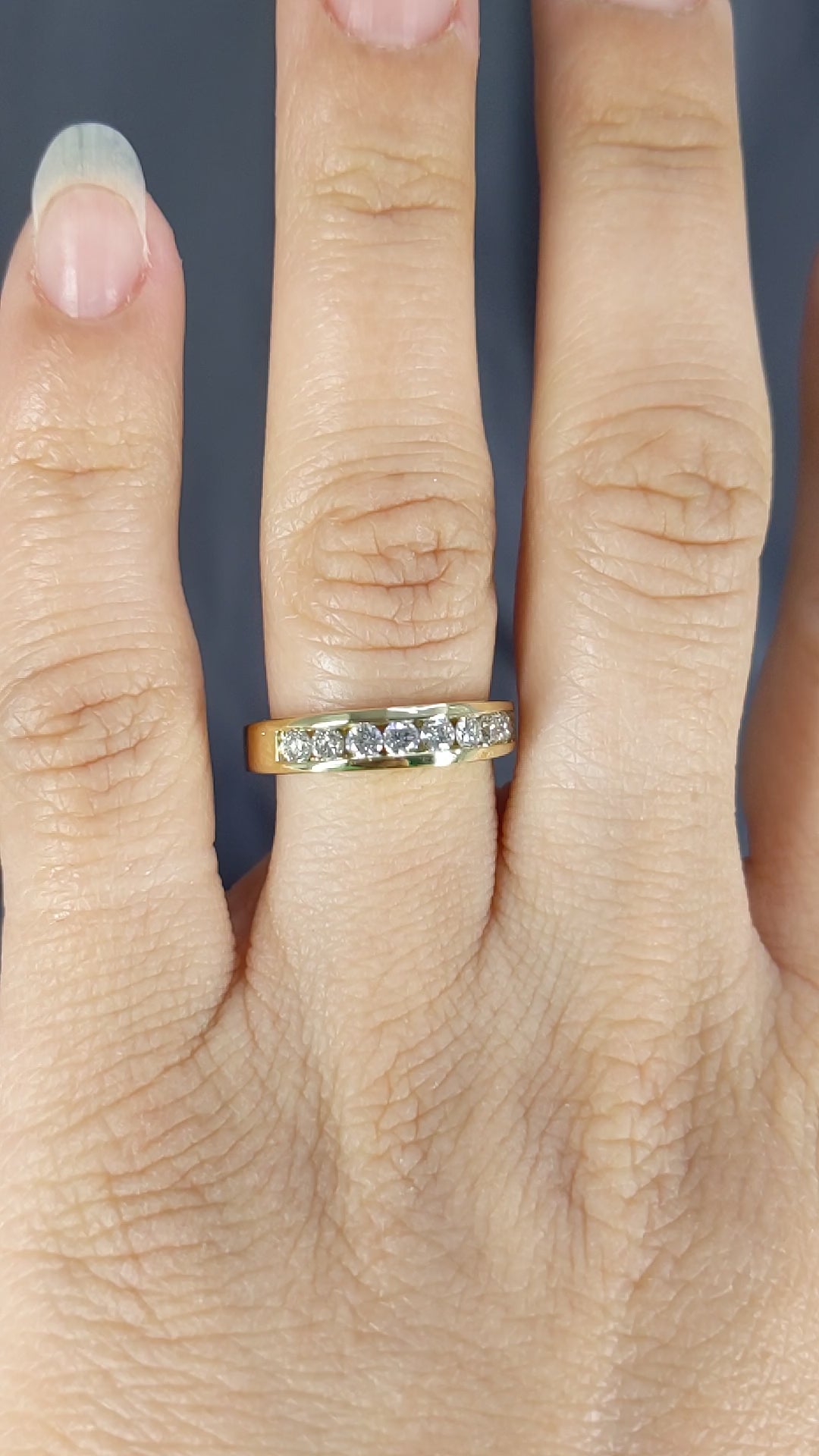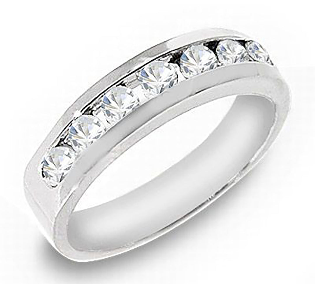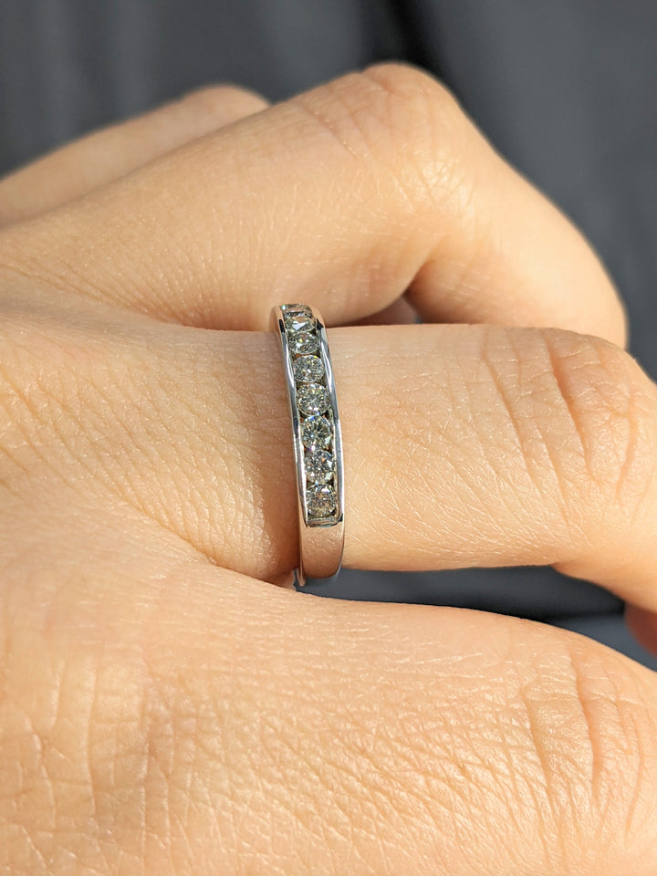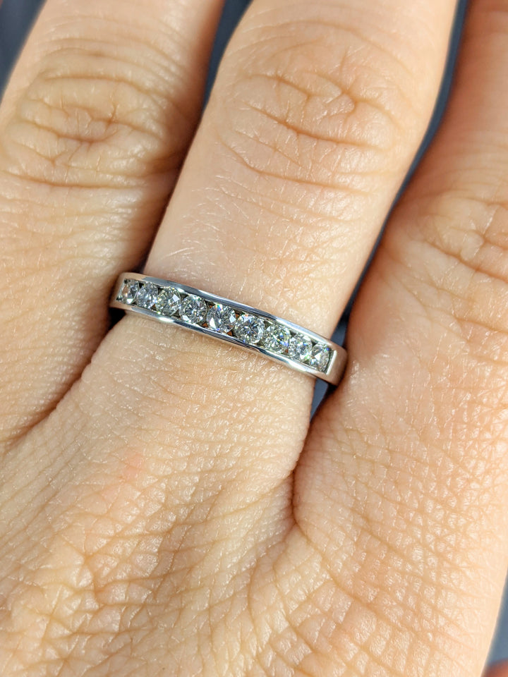 Ladies diamond band contains 0.50 ct. total of round brilliant cut diamonds in a channel setting halfway down the band. The diamonds are graded in VS Clarity and F-G Color. Handcrafted in your choice of 14k Gold, 18k Gold, or Platinum 950 setting. We also offer 1-Year Layaway program. You can reach us at 1-888-967-5353 to speak to one of our jewelry specialist.
