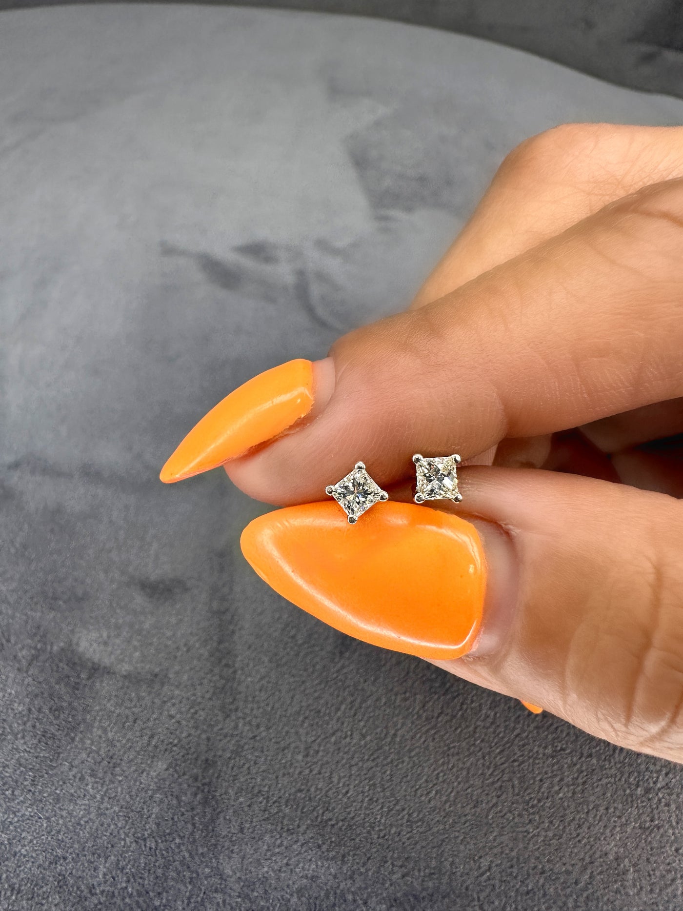 4-Prong princess cut diamond stud earrings with a total of 0.50 ct. tw. diamonds graded as SI Clarity and H-I Color. Handcrafted in your choice of 14k Gold, 18k Gold or Platinum 950 setting. We also offer a 1-Year Layaway program. You can reach us at 1-888-967-5353 to speak to one of our jewelry specialist.