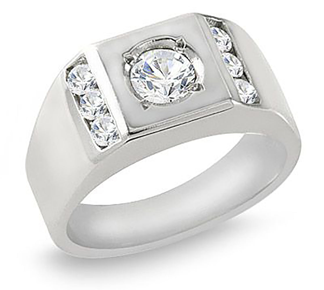 Men's diamond ring with 0.80 ct. tw. round cut diamonds. The center stone consists of a 0.50 ct. tw. round cut in a bezel/prong setting, surrounded by an additional 0.30 ct. tw. round cut side diamonds in a channel setting. The stones are graded as VS Clarity and G-H Color. Approximately 5 mm in width and a polish finish. Handcrafted in your choice of 14k Gold or 18k Gold setting. We also offer a 1-Year Layaway program. You can reach us at 1-888-967-5353 to speak to one of our jewelry specialist.