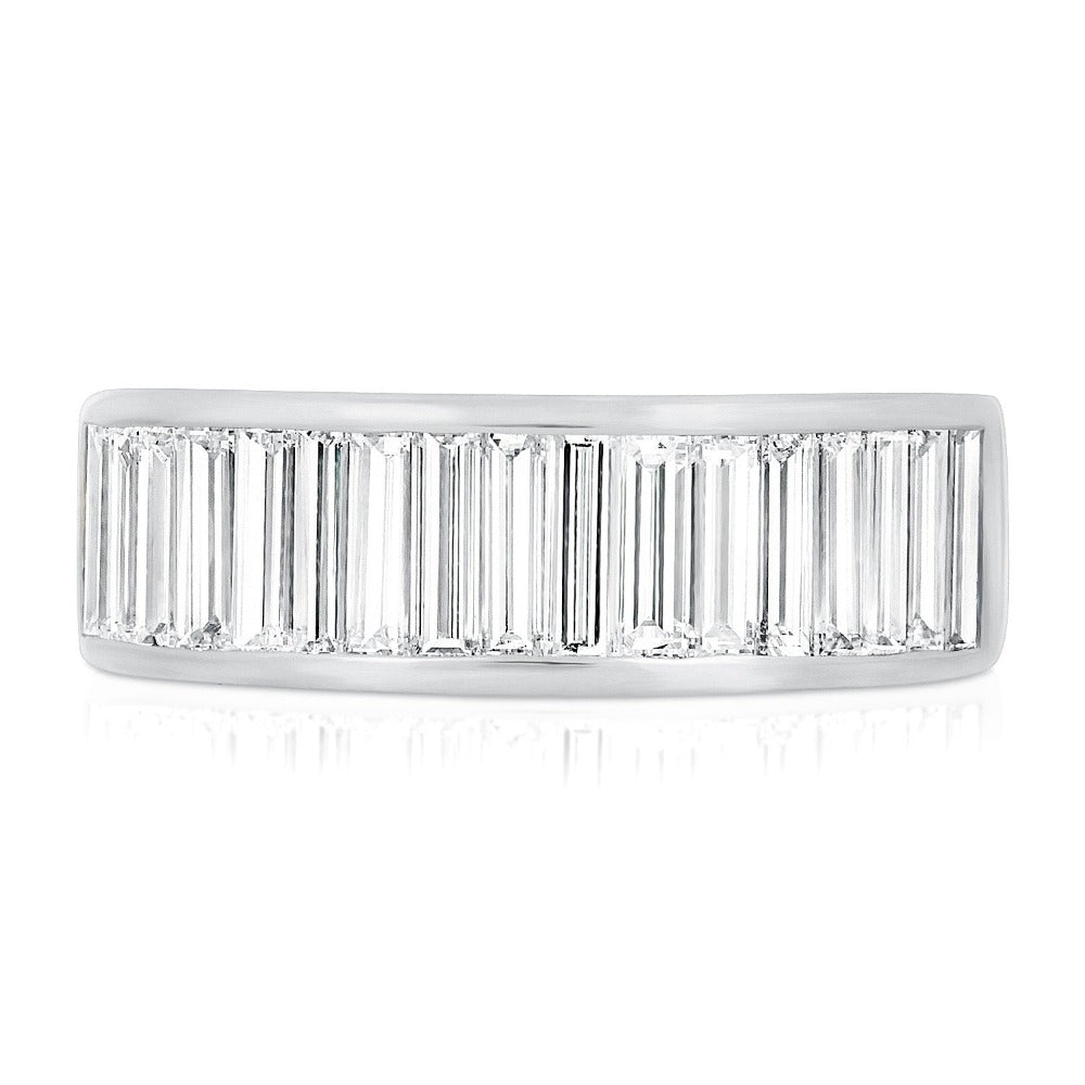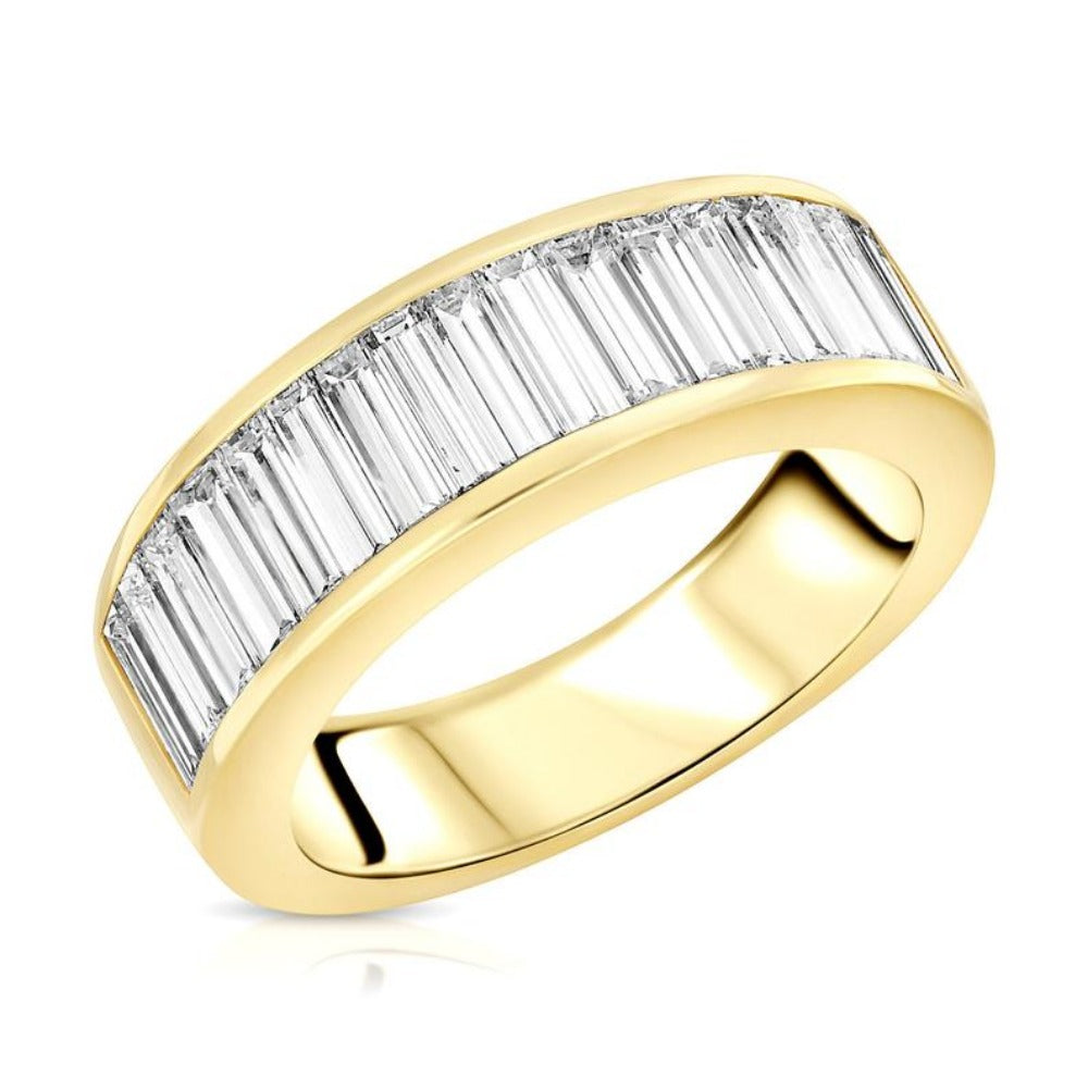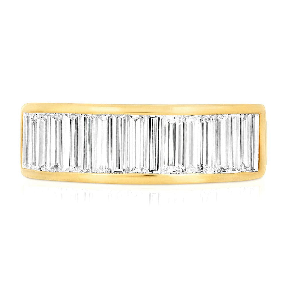 This stylish men's diamond band is the perfect way to upgrade any look. Featuring 2.30 ct. tw. of baguette cut diamonds that are channel set in a modern design, this eye-catching band is sure to turn heads. Color G and Clarity VS give this band a brilliant sparkle. Handcrafted in your choice of 14k Gold, 18k Gold, or Platinum 950. We offer a 1-Year Layaway program. You can reach us at 1-888-967-5353 to speak to one of our jewelry specialist.