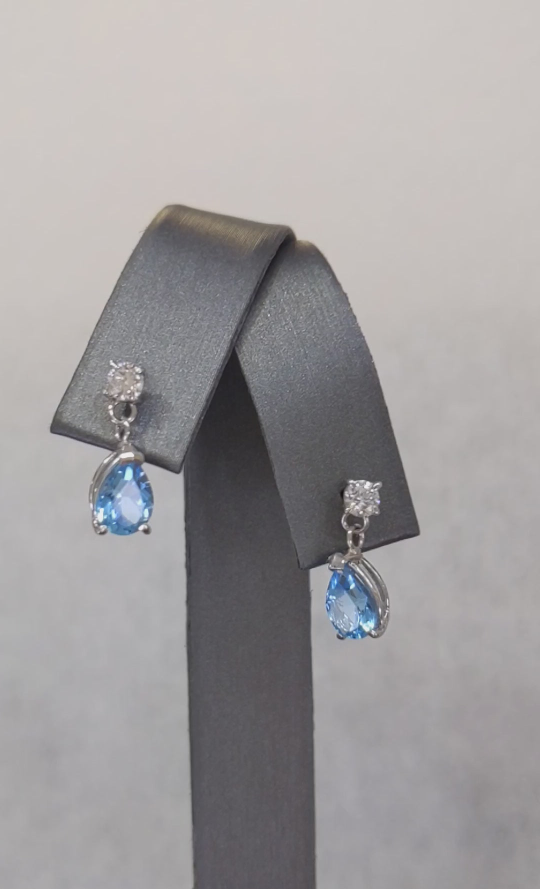 Drop down diamond and blue topaz earrings. With a total of 0.20 ct. tw. round brilliant cut diamonds and a total of 2.00 ct. tw. pear cut blue topaz gemstones. The diamonds are graded as SI Clarity and H-I Color. Handcrafted in your choice of 14k White Gold or 14k Yellow Gold. We also offer a 1-Year Layaway program. You can reach us at 1-888-967-5353 to speak to one of our jewelry specialist.