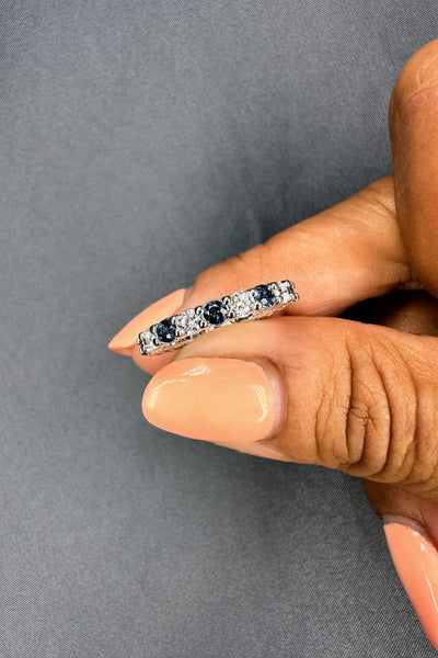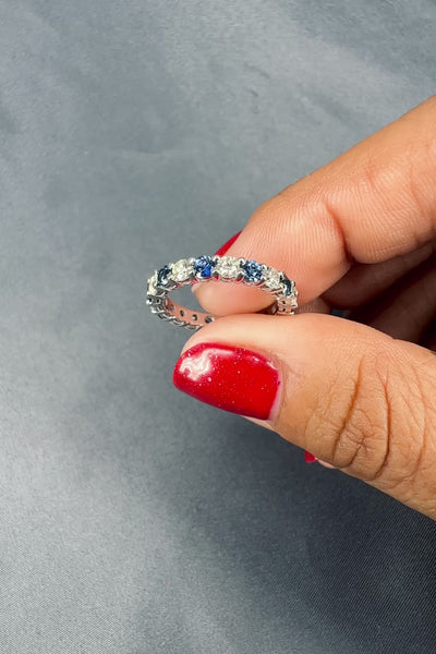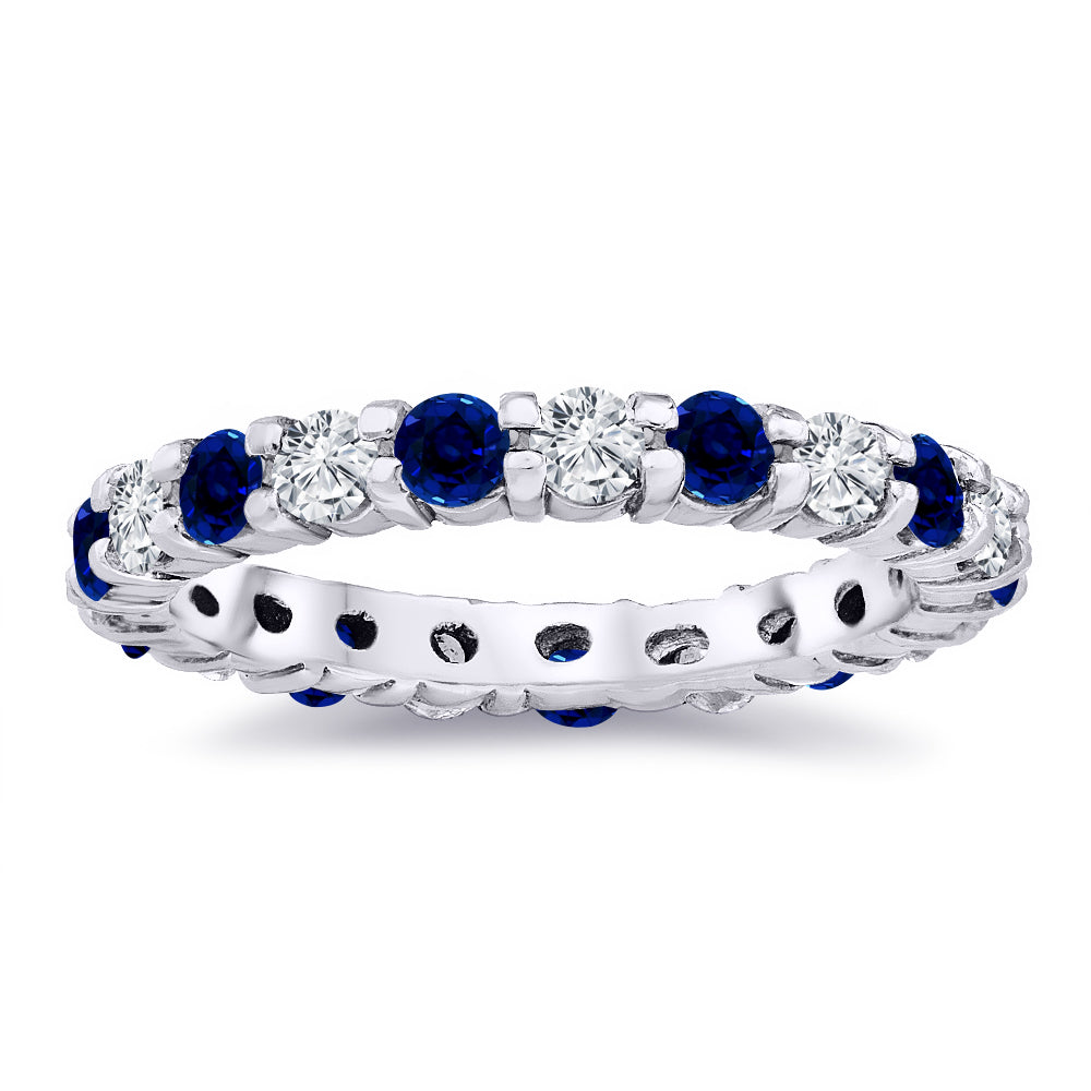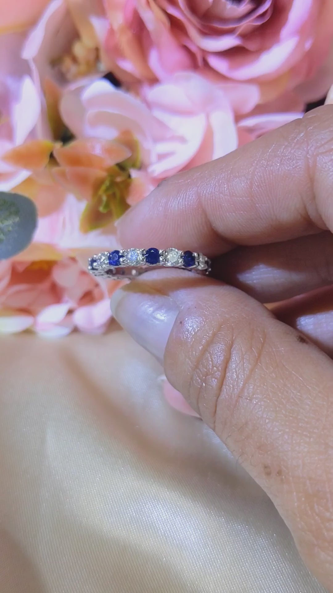 2.80 ct. tw. brilliant round cut diamond and natural blue sapphire band. AAA Natural Blue Sapphire. Diamond Color G, Clarity SI2. Handcrafted in your choice of 14k Gold, 18k Gold or Platinum 950 setting. We also offer a 1-Year Layaway program. You can reach us at 1-888-967-5353 to speak to one of our jewelry specialist.
