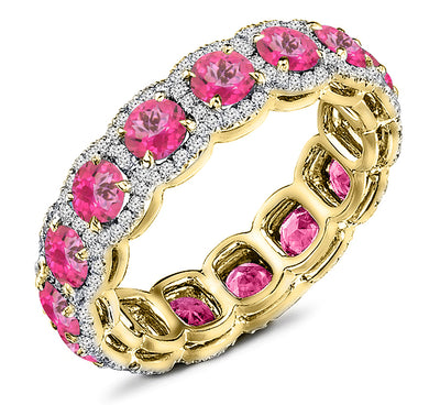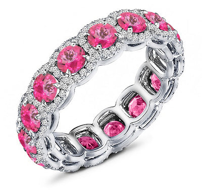Diamond and natural pink topaz eternity band. An eternity of stones all around the band gives this design so much sparkle. It consists of 1.50 ct. tw. round brilliant cut diamonds and 3.00 ct. tw. round cut pink topaz in a combination prong and pave setting. The diamonds are graded as SI Clarity and G-H Color. Handcrafted in your choice of 14k Gold, 18k Gold, or Platinum 950 setting. We also offer a 1-Year Layaway program. You can reach us at 1-888-967-5353 to speak to one of our jewelry specialist.
