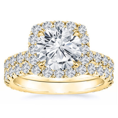 These two rings compliment each other perfectly. With a combined weight of 1.70 ct. tw. in diamonds, the engagement ring has a total weight of 1.20 ct. The brilliant round cut center stone diamond can be customized to range weight between 0.50-2.00 ct. tw. It has an additional 0.62 ct. tw. of round cut diamonds that halo the center stone and extend out to just below half way down the ring. The matching eternity style wedding ring consist of 0.58 ct. tw. diamond. Handcrafted on a prong setting in your choice of 14K White, Yellow, or Rose Gold. We offer a 1 year Layaway program. You can contact us at 1-888-967-5353 to speak to one of our jewelry specialist.