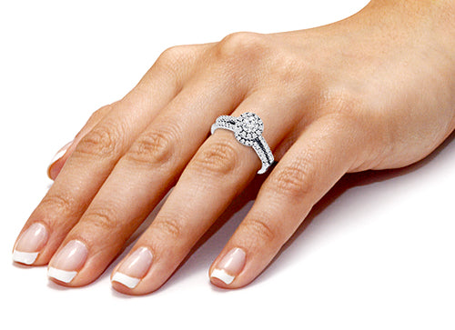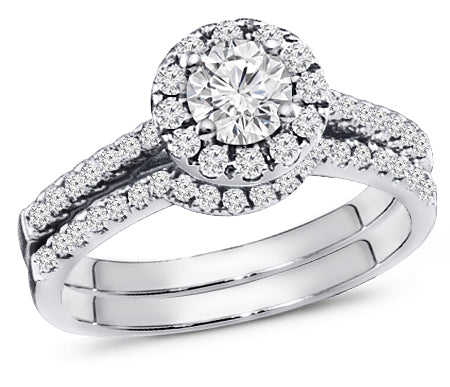 This beautiful halo diamond engagement ring and its perfectly matched wedding band consist of a 0.15 ct. tw. round brilliant cut center stone diamond that is surrounded by 0.35 ct. tw. pave-set round cut diamonds on the ring for the halo and hugging matching band. With SI Clarity and G-H Color. Handcrafted in 14k, 18k Gold, or Platinum 950 setting. We also offer 1 Year Layaway program. You can reach us at 1-888-967-5353 to speak to one of our jewelry specialist.