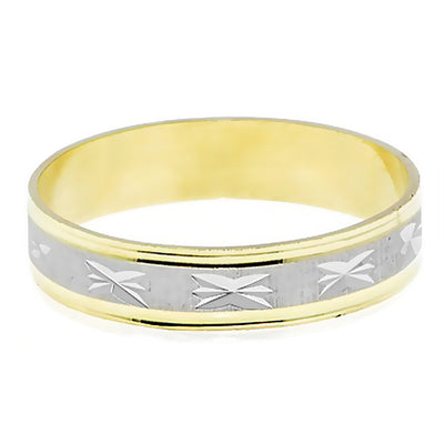 5mm Two Tone Gold Band. With star designs around the band and a brush finish. Handcrafted in your choice of 14k Gold or 18k Gold setting. We also offer a 1-Year Layaway program. You can reach us at 1-888-967-5353 to speak to one of our jewelry specialist.
