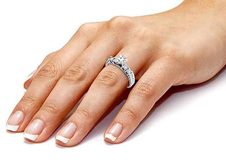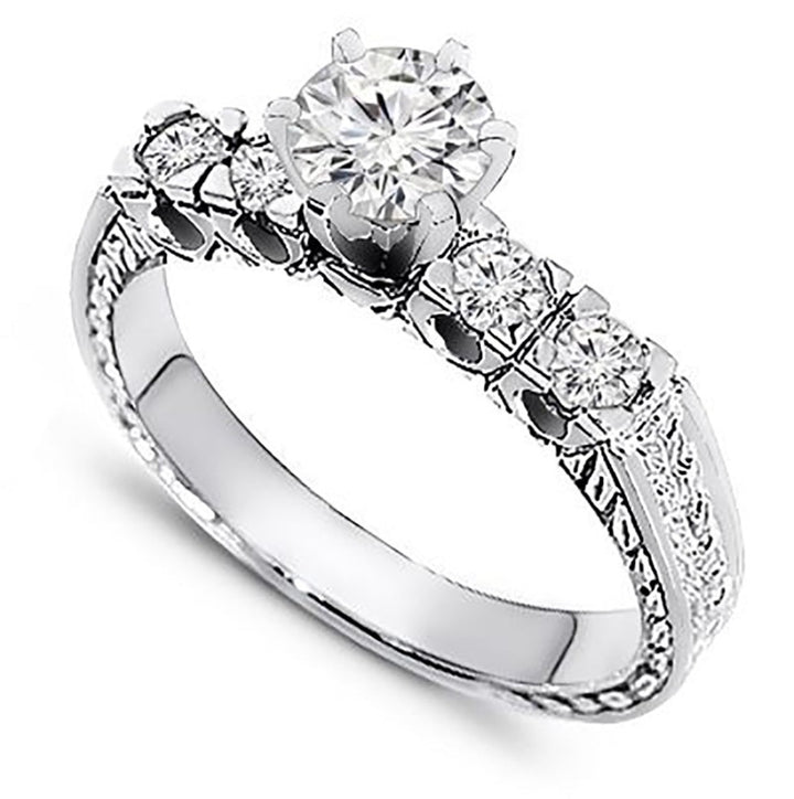 This unique milgrain etched with deep u-shape prongs give this ring a vintage appeal with a total of 5-stones it consist of a 0.50 ct. tw. round brilliant center stone diamond with an additional 0.20 ct. tw. round cut side diamonds. This center stone diamond may be customized in size to weigh anywhere between 0.50-2.00 ct. tw. Handcrafted in a vintage design to add a unique finish. Can be complemented in your choice of 14k Gold, 18k Gold, or Platinum 950 setting. We also offer 1 year Layaway program. Please contact our Jewelry Experts at Toll Free 1888-967-5353.