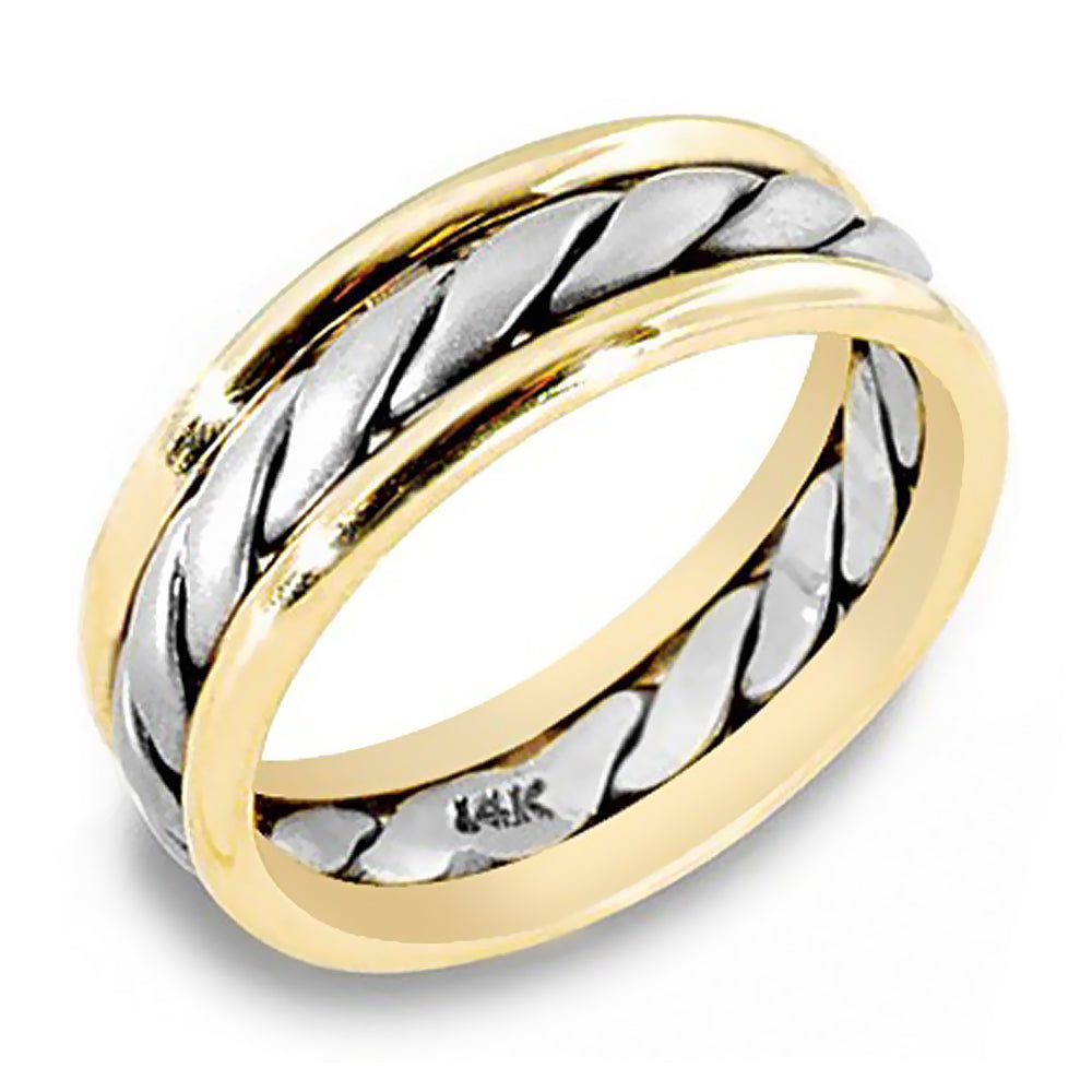 7 mm Two tone rope twist wedding band has a rope twist design in the center and a solid edge on the outer part of the band with a high polish finish on a comfort-fit band. Handcrafted in your choice of 14k Gold or 18k Gold. We also offer a 1-Year Layaway program. You can reach us at 1-888-967-5353 to speak to one of our jewelry specialist.