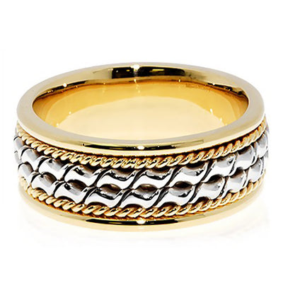 7 mm two-tone gold band has two rows of this unique design in white gold in the center with yellow gold rope detail on each edge of the white gold design with a high polish finish, comfort-fit band. Handcrafted in your choice of 14k Gold or 18k Gold setting. We also offer a 1-Year Layaway program. You can reach us at 1-888-967-5353 to speak to one of our jewelry specialist.