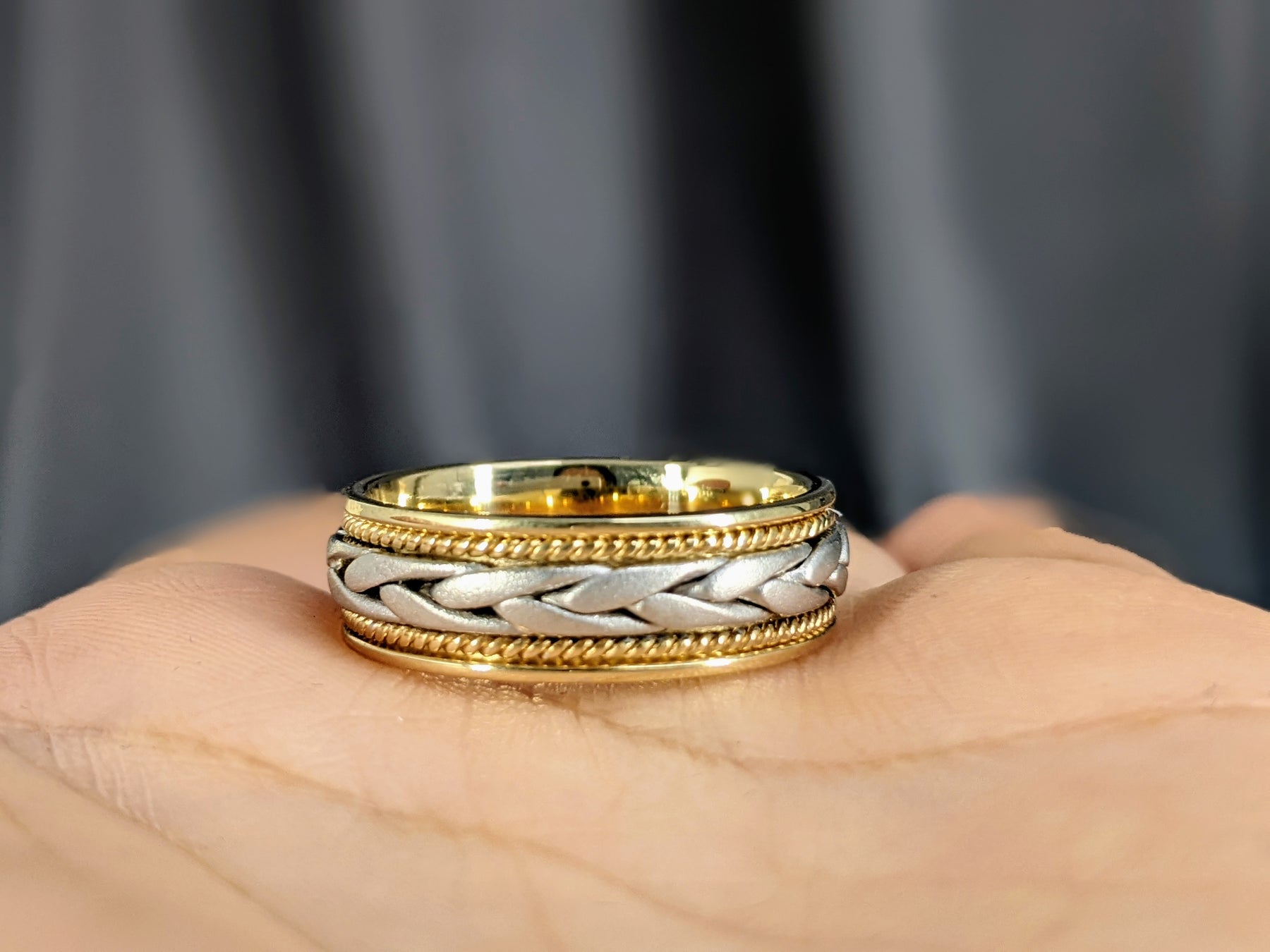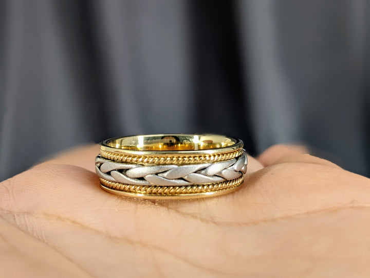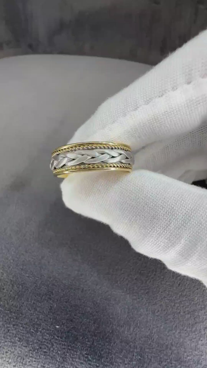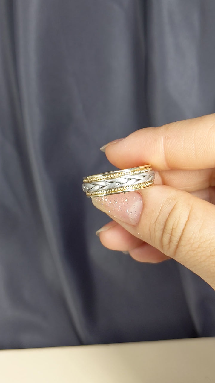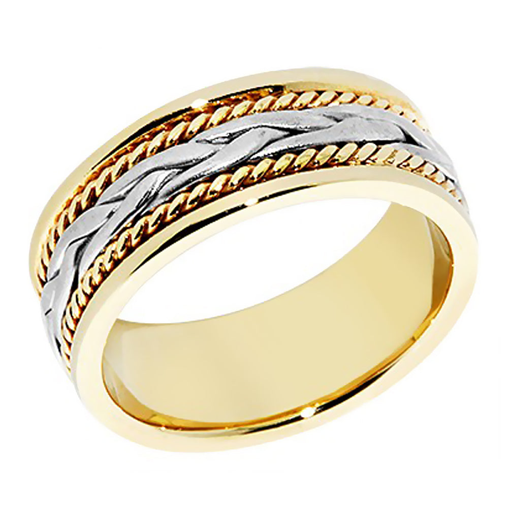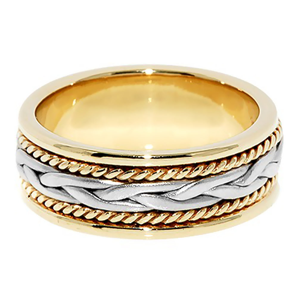 7 mm two tone solid gold band has a beautiful large center hand braid in white gold surrounded by yellow gold rope on each sides of the middle braid with a polish finish, comfort-fit band. Handcrafted in your choice of 14k Gold or 18k Gold setting. We also offer a 1-Year Layaway program. You can reach us at 1-888-967-5353 to speak to one of our jewelry specialist.