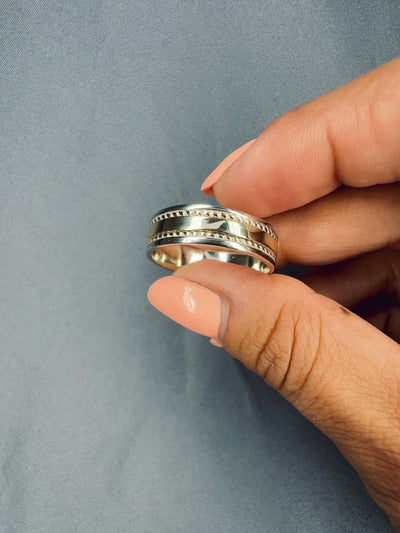 7 mm two tone solid gold wedding band. This dominant white gold band has two rope accents on each side of the plain yellow gold band with a high polish finish comfort-fit. Handcrafted in your choice of 14k Gold or 18k Gold setting. We also offer a 1-Year Layaway program. You can reach us at 1-888-967-5353 to speak to one of our jewelry specialist.