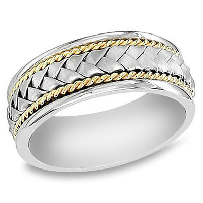 8 mm two tone hand braid in white gold with yellow gold rope accents on each side of the wedding band in a high polish finish, comfort-fit band. Handcrafted in your choice of 14k Gold or 18k Gold setting. We also offer a 1-Year Layaway program. You can reach us at 1-888-967-5353 to speak to one of our jewelry specialist.