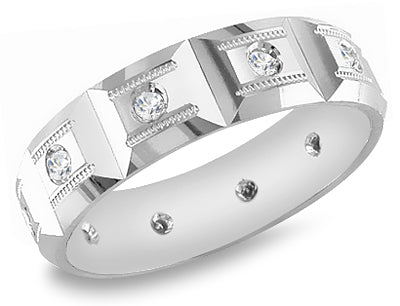 Diamond wedding band with 0.39 ct. tw. round cut diamonds evenly set around the band in a bezel setting with a milgrain etching on each square pattern design. The diamonds graded as VS Clarity and G-H Color. Approximately 6 mm in width and a polish finish. Handcrafted in your choice of 14k Gold or 18k Gold setting. We also offer a 1-Year Layaway program. You can reach us at 1-888-967-5353 to speak to one of our jewelry specialist.