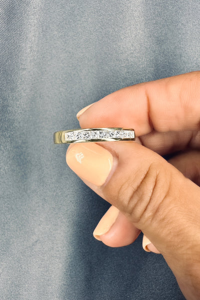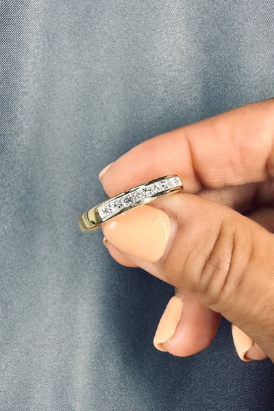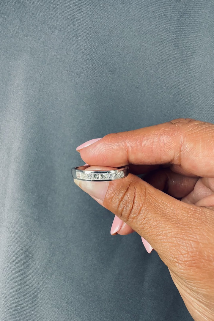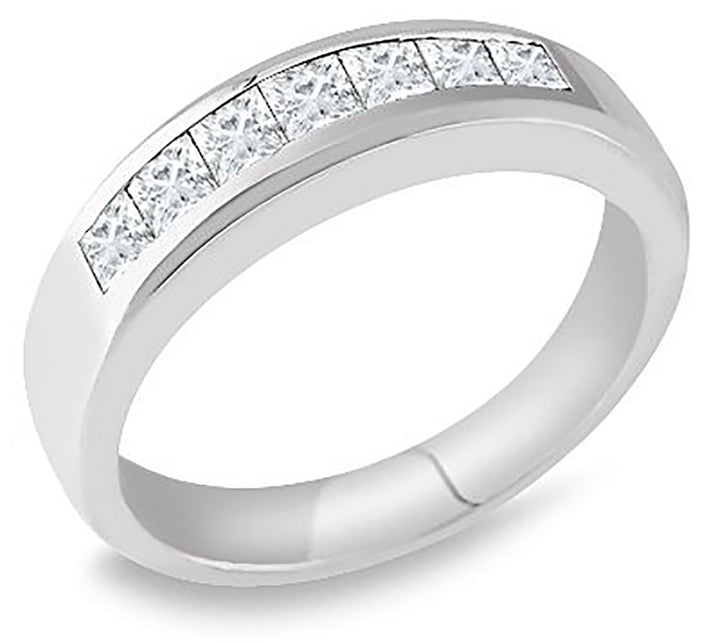 Men's diamond channel set diamond band consist of 0.75 ct. tw. in princess cut diamonds with the band measuring approximately 3 mm in width with a high polish finish. The stones are graded as VS Clarity and G-H Color. Handcrafted in your choice of 14k Gold, 18k Gold, or Platinum 950 setting. We also offer a 1-Year Layaway program. You can reach us at 1-888-967-5353 to speak to one of our jewelry specialist.