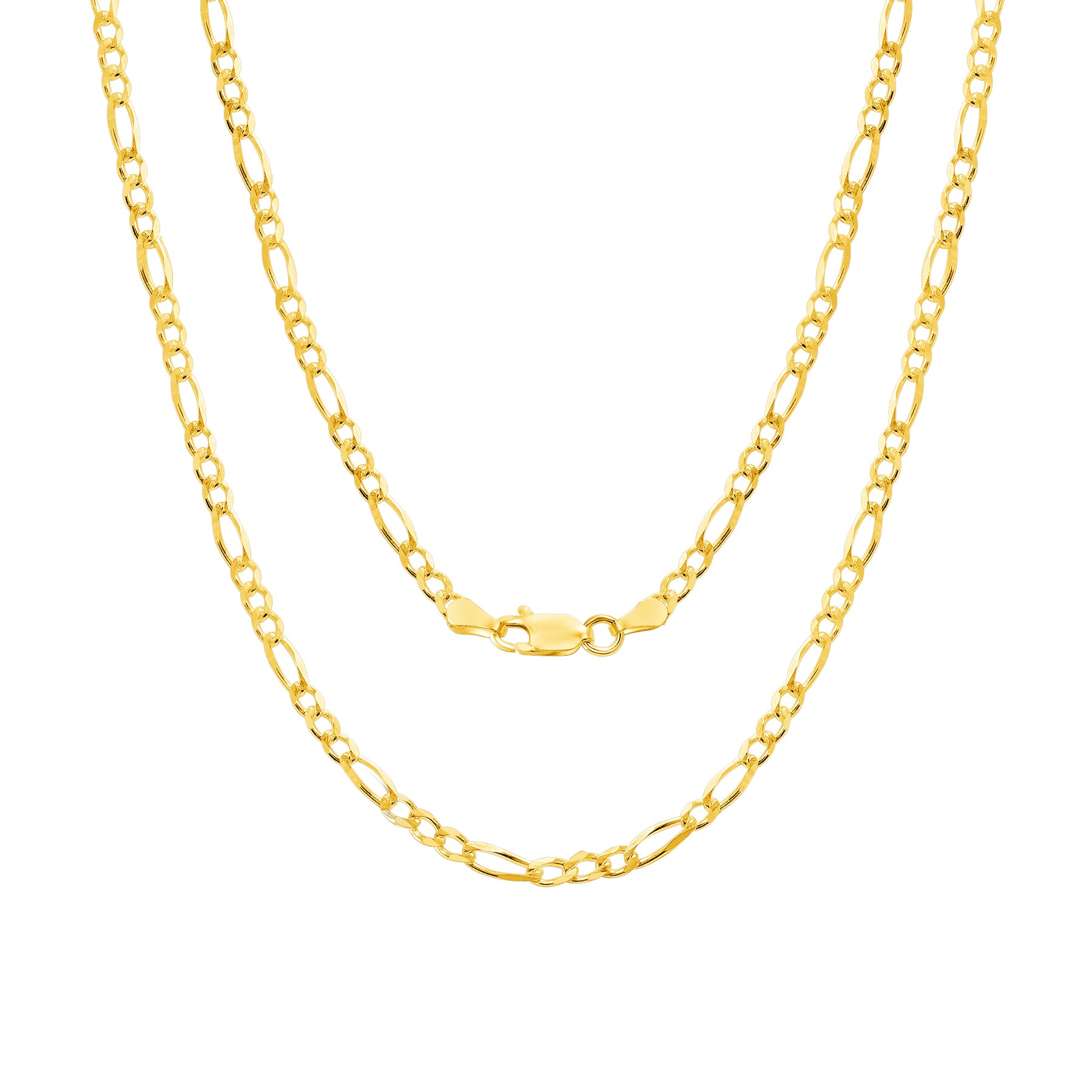 Solid 14K yellow classic Figaro link chain necklace gives the highest shine. Our chains are perfect to wear with many kinds of pendants, in layers or by itself. Every piece is carefully inspected before shipping to ensure you received the highest quality chain. You can reach us at 1-888-967-5353 to speak to one of our jewelry specialist.